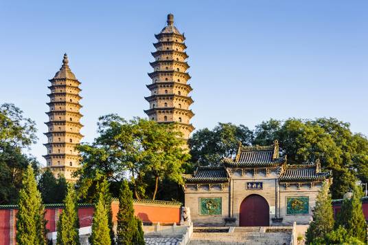 永祚寺雙塔,雄偉異常,雙雙聳立如筆,故有“文筆雙塔”之譽(yù),更被譽(yù)為太原的標(biāo)志。雙塔并非同時建成,東南塔稍早,西北塔較晚。兩塔相距60米,取“真言密教以十六數(shù)表圓滿無盡”之意。二塔均為全磚石結(jié)構(gòu),只在各層角檐內(nèi)裝有一根挑木,構(gòu)建技巧十分精湛。