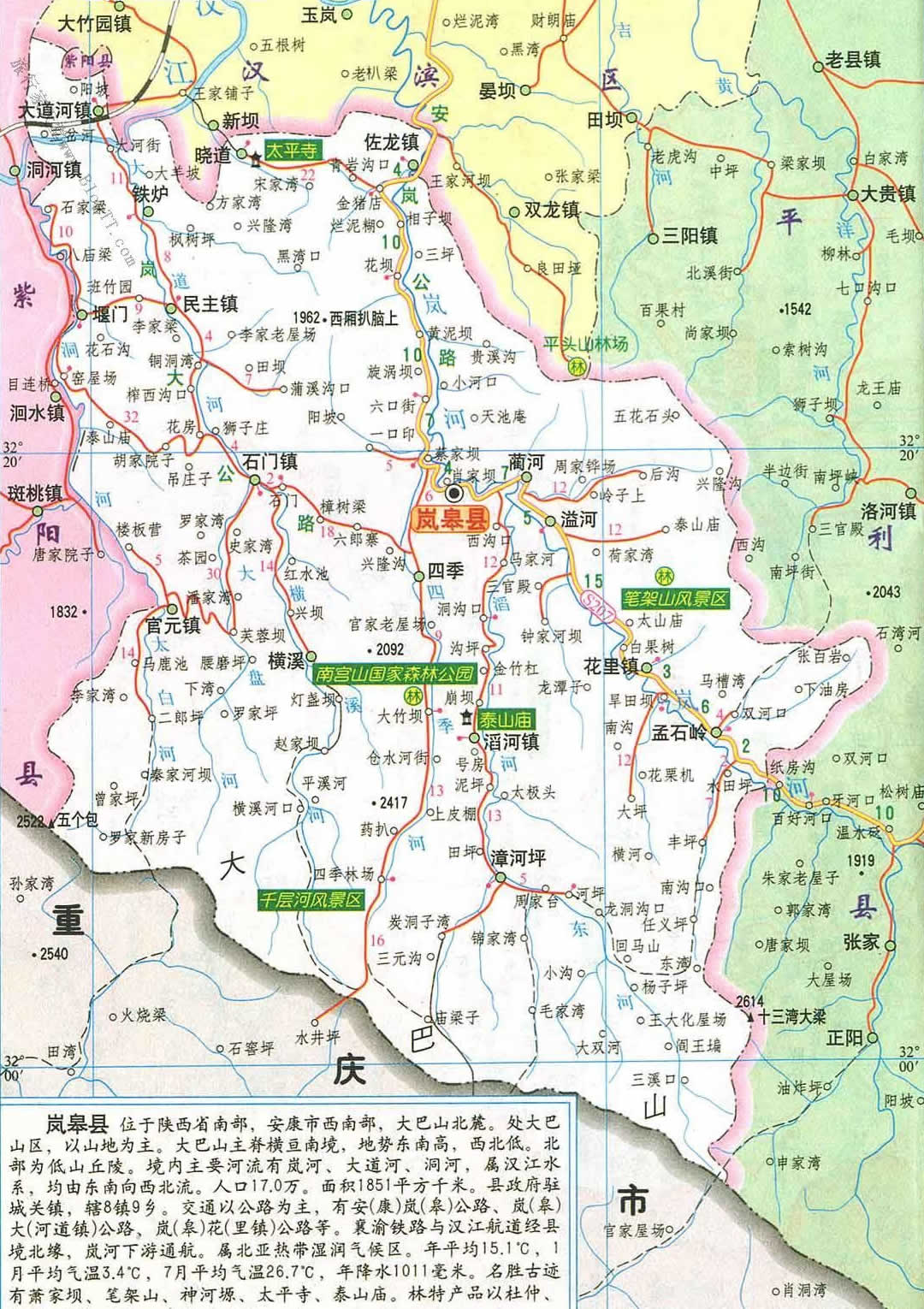 嵐皋縣位于陜西南部,大巴山北麓,南與重慶市城口縣接壤,北與安康市漢濱區(qū)、西與紫陽(yáng)縣、東與平利縣相鄰,最高海拔2641米,最低海拔331米,北距安康市區(qū)71公里,全縣轄17個(gè)鄉(xiāng)鎮(zhèn)198個(gè)行政村,4.4萬(wàn)戶,全縣總面積1956平方公里,人口17萬(wàn)。其中農(nóng)業(yè)人口15.2萬(wàn)人,境內(nèi)以山地為主,屬典型的亞熱帶大陸性季風(fēng)氣候。
