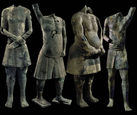 此套展品為秦代的陶器,出土于秦始皇帝陵K9901陪葬坑。一號百戲俑,殘高152.00厘米,右臂有刻劃文字“咸陽親”。三號百戲俑,殘高172.00厘米。四號百戲俑,殘高152.00厘米。十九號百戲俑,殘高181.00厘米。1999年,考古人員在秦陵東南部內外城垣之間的陪葬坑內,試掘出土了陶俑11件,它們上體裸露,下體著裳。動作有直立狀、雙手卷衣狀、一手叉腰一手高舉、雙腿弓箭步、半跪狀等。