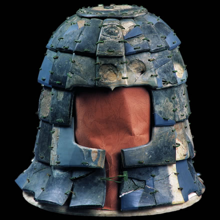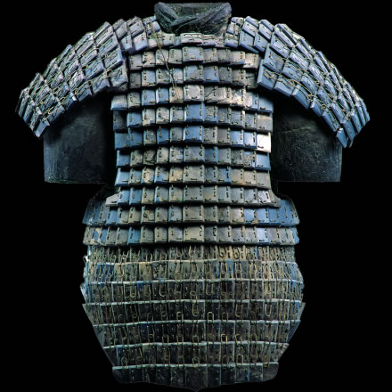 此展品為秦代的石器,通長64.00厘米,出土于秦始皇帝陵K9801陪葬坑。鎧甲由前、后身甲和一對披膊組成,共有甲片380片。鎧甲的開合口位于右側肩、胸的交接處。