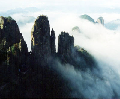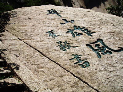 東峰頂生滿巨檜喬松,濃蔭蔽日,環(huán)境非常清幽。游人自松林間穿行,上有團(tuán)才綠蔭,如傘如蓋,耳畔陣陣松濤,如吟如詠,頓覺心曠神怡,超然物外。明書畫家王履在《東峰記》中談他的體會(huì)說:高大的檜松蔭蔽峰頂,樹下石徑清爽幽靜,風(fēng)穿林間,松濤涌動(dòng)更添一段音樂般的韻致,其節(jié)律,此起彼伏,好象吹彈絲竹,敲擊金石,多么美妙啊。