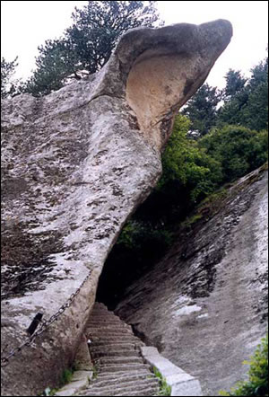 古時(shí)稱登東峰道路艱險(xiǎn),《三才圖會(huì)》記述說:山崗如削出的一面坡,高數(shù)十丈,上面僅鑿了幾個(gè)足窩,兩邊又無樹枝藤蔓可以攀援,登峰的人只有爬在崗石上,腳手并用才能到達(dá)峰巔。今已開辟并拓寬幾條登峰臺(tái)階路,游人可安全到達(dá)。