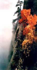 峰南側(cè)是千丈絕壁,直立如削,下臨一斷層深壑,同三公山、三鳳山隔絕。南峰由一峰二頂組成,東側(cè)一頂叫松檜峰,西側(cè)一頂叫落雁峰,也有說南峰由三頂組成,把落雁峰之西的孝子峰也算在其內(nèi)。這樣一來,落雁峰最高居中,松檜峰居?xùn)|,孝子峰居西,整體形象一把圈椅,三個(gè)峰頂恰似一尊面北而坐的巨人。明朝人袁宏道在他的《華山記》一書中記述南峰形象說:“如人危坐而引雙膝。”