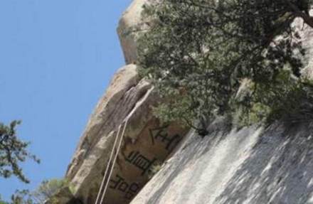 關(guān)于全真巖各類史志書籍記載頗多。《三才圖會(huì)》載:“靜室旁有巖,高數(shù)十丈,遙覆其室,并書‘全真巖’三字。”《華岳圖經(jīng)》中記述,全真巖三字每字大約七八尺高,鐫刻在那樣一個(gè)地方,除過能騰云駕霧的神仙,凡夫俗子肯定是辦不到的。明書畫大家王履的《南峰記》中記述得列為形象:巖好像一個(gè)彎腰人的頭部,遠(yuǎn)遠(yuǎn)遮蓋住腹部的石室。倒坎巖頂端鐫“全真巖”三字,并涂以紅色。世上沒有神仙,刻字肯定是人類所為,但在這樣特殊的位置,上不可上,下不可下,除非懸浮于空中才能可能。古人是如何做到這一點(diǎn),迄今無解。