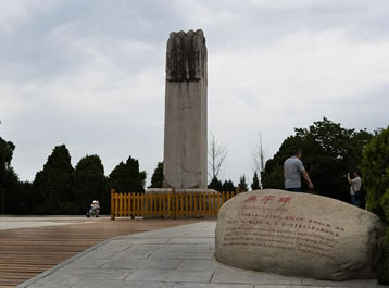 在朱雀門外的司馬道東側(cè),聳立著聞名于世的無字碑,通身取材于一塊完整的巨石,高7.53米,寬2.1米,厚1.49米,總重量98.8噸,給人以凝重厚實(shí),渾然一體的美感。碑額未題碑名,碑額陽面正中一條螭龍,左右側(cè)各四條,共有九條螭龍,故亦稱“九龍碑”。碑的兩側(cè)有升龍圖,各有一條線刻而成騰空飛舞的巨龍,栩栩如生。碑座陽面還有線刻的獅馬圖(或稱獅馬相斗圖),長2.14米,寬0.66米。其馬屈蹄俯首,雄獅則昂首怒目。碑上還有許多花草紋飾,線條精細(xì)流暢。