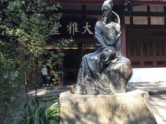 詩史堂是中軸線上的第三重建筑,也是主體建筑。杜甫留下的1400多首詩歌,真實(shí)而生動(dòng)地展現(xiàn)了“安史之亂”前后唐代社會(huì)生活畫卷,反映了唐朝由盛轉(zhuǎn)衰的歷史。杜甫被后世尊為“詩圣”,他的詩歌被稱為“詩史”, “詩史堂”也因此得名。大廳的正中陳列著一尊由我國著名雕塑家劉開渠先生以寫實(shí)的手法來刻畫的杜甫塑像。