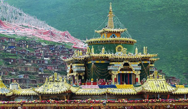 色達(dá)佛學(xué)院 距色達(dá)縣城20余公里處,有一條山溝叫喇榮溝,順溝上行數(shù)里,就是舉世聞名的喇榮寺五明佛學(xué)院,也稱色達(dá)佛學(xué)院。色達(dá)佛學(xué)院是世界上最大的藏傳佛學(xué)院之一。