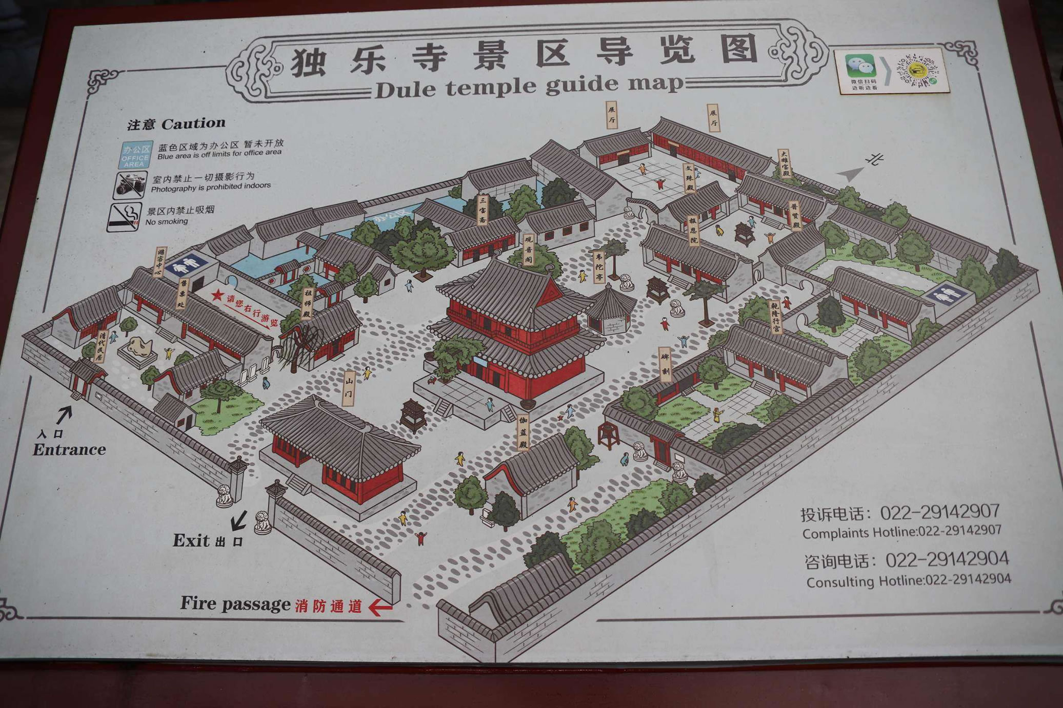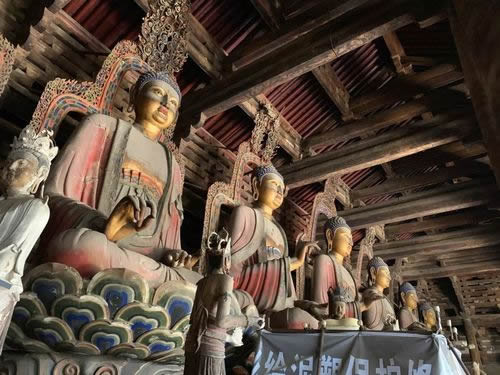 山門前兩稍間是兩尊遼代彩色泥塑金剛力士像,俗稱“哼”“哈”二將,后兩稍間是清代繪制的“四大天王”彩色壁畫。山門梁柱粗壯,斗拱雄碩,“升起”和“側(cè)腳”明顯。據(jù)說山門的牌匾乃嚴嵩所題。