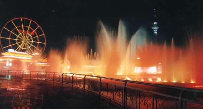 位于水上公園東門入口處,面積約6.5公頃的湖面,將靜態(tài)之水變?yōu)榛虮简v、或疊落、火噴涌的動態(tài)之水。從東到西依次排列了: