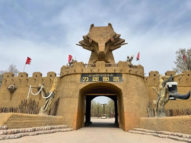 風格獨特、氣勢宏偉的大門就是刀郎人民俗村寨門。造型似刀郎人英雄男兒形象,體現(xiàn)刀郎人的勇敢彪悍、不屈不撓、勤勞智慧、熱愛子民的硬漢精神。
