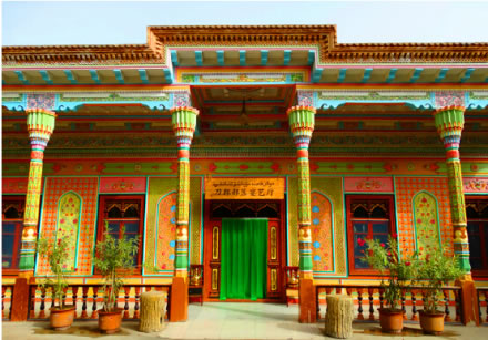 這座民族特色濃郁,極具刀郎人建筑風格的宴藝廳就是刀郎部落招待貴賓及聚會、就餐、欣賞刀郎歌舞的場所。餐廳裝飾工藝主要為刀郎人傳統(tǒng)的石膏雕、木雕和磚雕。墻面上色彩艷麗,植物花卉圖案的是石膏雕,回廊上的木柱子為木雕,據(jù)說這樣的一根柱子需要兩個工匠花一個月時間才可完成。屋檐最上面一層為磚雕。刀郎部落宴藝廳可容納300人就餐,在品嘗地道刀郎美味的同時還可欣賞刀郎歌舞表演。