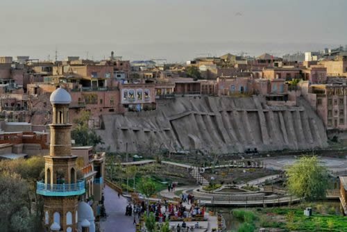 清朝自1760年在喀什噶爾設(shè)參贊大臣之后,作為天山以南的政治、經(jīng)濟(jì)、文化和交通中心,喀什噶爾城人口激增,舊城區(qū)居住不下,開(kāi)始向今解放路以西拓展。1762年筑徠寧城,與舊城只隔不足1公里。到1839年,徠寧城與舊城之間的地帶已全建為民居,清朝駐喀什噶爾阿奇木伯克郡王祖赫爾丁(即史書(shū)中所稱(chēng)“阿肯木伯克早敦”)主持了擴(kuò)城工程,將城西墻移至今尤木拉克協(xié)海爾路,與原徠寧城相連,在今老郵電局處新辟南門(mén),稱(chēng)“庫(kù)木代爾瓦扎”(沙門(mén)),南關(guān)一帶成為繁華的手工業(yè)區(qū),形成了以艾提尕大清真寺為中心的一座新城。