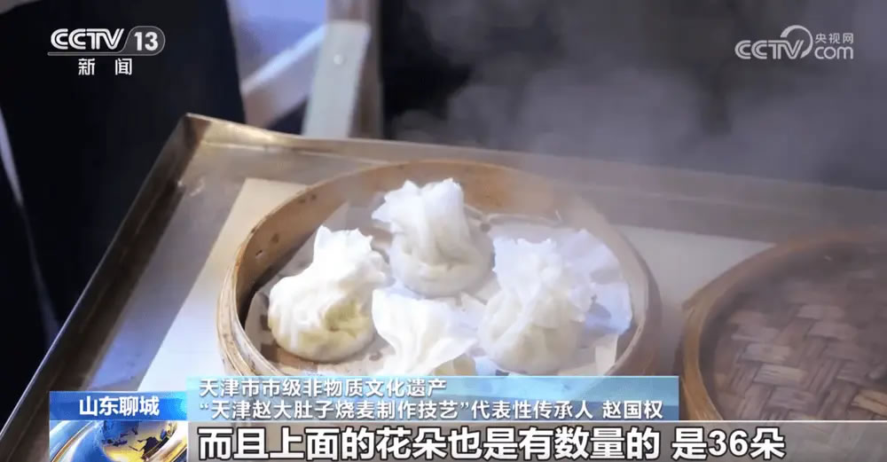 天津市市級非物質文化遺產“天津趙大肚子燒麥制作技藝”代表性傳承人 趙國權:趙大肚子燒麥最大的特點是皮子特別薄,上面的花朵也是有數(shù)量的,是36朵。一邊24朵一邊12朵,代表著中國的24個節(jié)氣和一年的12個月份。