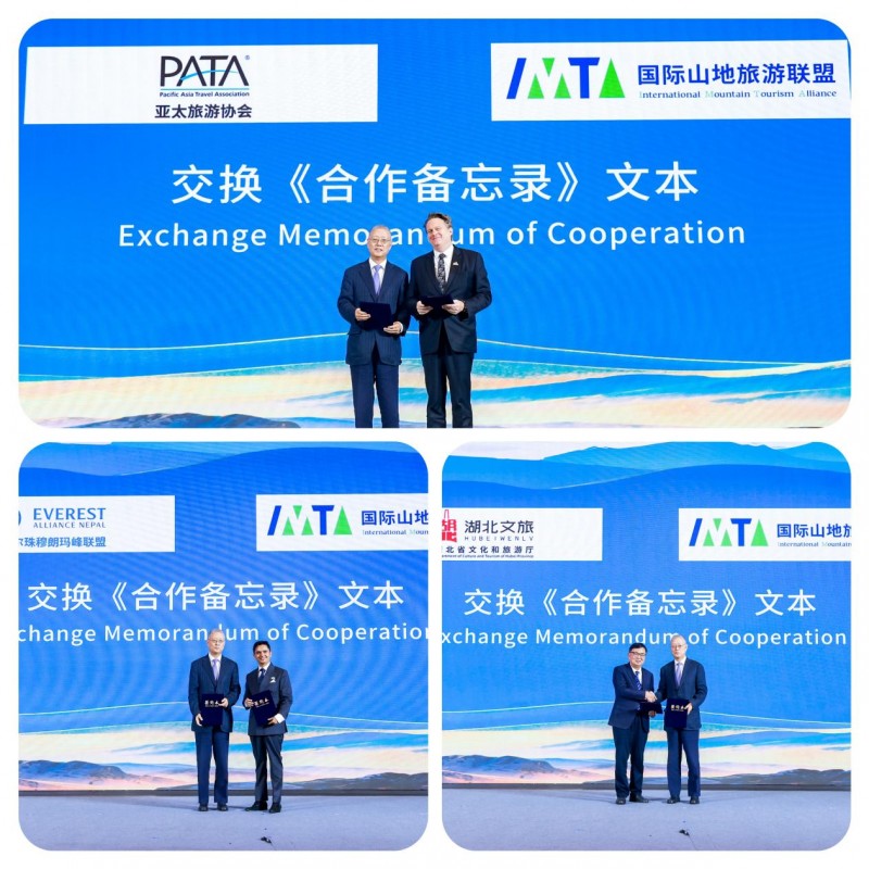 國(guó)際山地旅游聯(lián)盟副主席兼秘書(shū)長(zhǎng)何亞非分別與亞太旅游協(xié)會(huì)主席彼得·西蒙(Peter Semone)、尼泊爾珠穆朗瑪峰聯(lián)盟主席蘇大山·尼泊爾(Sudarshan Nepal)、湖北省文化和旅游廳副廳長(zhǎng)徐勇交換合作備忘錄,旨在通過(guò)資源共享、優(yōu)勢(shì)互鑒,為全球旅游業(yè)可持續(xù)增長(zhǎng)注入新動(dòng)能、貢獻(xiàn)實(shí)踐力量。