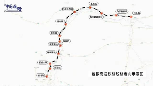 包銀高鐵起自包頭站,經(jīng)內(nèi)蒙古自治區(qū)包頭市、巴彥淖爾市、鄂爾多斯市、烏海市,寧夏回族自治區(qū)石嘴山市、銀川市,接入銀川站,正線全長519公里,設(shè)計(jì)時(shí)速250公里,實(shí)行分段建設(shè)。其中,惠農(nóng)至銀川段全長97公里,已于2024年10月開通運(yùn)營,此次開通的包頭至惠農(nóng)段全長422公里,共設(shè)包頭、白彥花西、烏拉特前旗、五原、巴彥淖爾、磴口、堿柜、烏海、烏海南、惠農(nóng)南10座車站,其中包頭、巴彥淖爾、烏海、惠農(nóng)南站為既有車站,其余車站為新建車站。