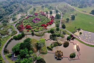 百花園為中國科學(xué)院西雙版納熱帶植物園的第一景,占地面積353畝,現(xiàn)收集保存與展示熱帶花卉植物645種(品種)。百花園植物布景主要采用孤植、純林大片種植、同類多品種集中收集、?茖俦4、攀緣及水生花卉植物多種方式展示。并力求與地形水域巧妙結(jié)合,形成不同的賞景空間,創(chuàng)造“天女散花”、“層林盡染”、“五彩繽紛”和“花開花落”等景觀效果。借助區(qū)內(nèi)大量花卉植物,通過挖掘花卉與人們?nèi)粘I睢⑿叛龊颓楦械年P(guān)聯(lián),以及古往今來的文人墨客以花卉植物創(chuàng)作出的傳說故事、詩歌等文學(xué)作品,以對聯(lián)、字畫、牌匾等形式展示于園區(qū)內(nèi),充分展示花卉植物的科學(xué)和文化內(nèi)涵。