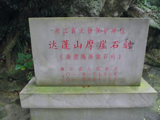 摩崖石刻是后人為緬懷徐福東渡這一歷史事件而保存下來的歷史古跡,大約刻于唐宋間,故而十分珍貴,具有極高的歷史研究?jī)r(jià)值。石刻面朝東南,高1.2米,寬3.5米,整幅畫面展現(xiàn)“人馬步金橋”、“鯉魚跳龍門”、“麟鳳呈祥瑞”等場(chǎng)面,表現(xiàn)了徐福率童男童女從達(dá)蓬山東渡出海的史實(shí),也是全國(guó)唯一幸存的反映徐福東渡的歷史古跡。清康熙庚子年僧人惠初游覽達(dá)蓬山時(shí),在其中挖了神龕,并刻有“靈臺(tái)自若”等字樣。