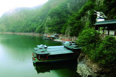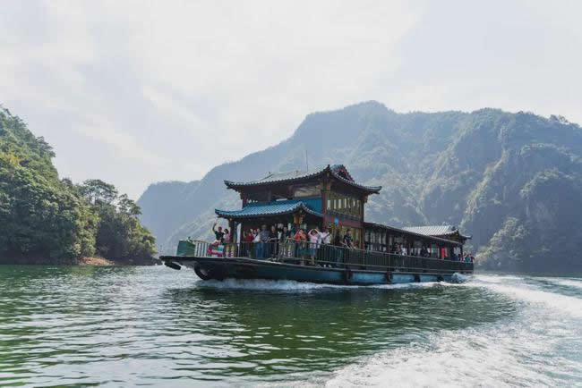 由紫藤長廊拾階登上壩頂,眼前展現(xiàn)的是一湖靜水,綠水蕩漾,深不可測。 水面上疾駛的游船,不時(shí)激起層層漣漪,把兩岸的元寶峰,鷲鷹峰,仙桃峰、杜鵑峰、老僧峰、仙掌峰等山峰的倒影彎折。 泛舟湖上,水鳥在水面低飛,狹長的湖面見不到盡頭,大有“青山綠水景無盡”之感,又有“一折青山一扇屏,一彎綠水一古琴”的詩意。沿湖兩邊,蔥蘢俊秀,美不勝收。春天萬木崢嶸,紅杜鵑從綠樹叢中透出;夏天滿山蔥郁,濃蔭蔽日;一到秋冬季節(jié),蒼黃的銀杏葉和紅艷的楓葉,點(diǎn)綴在一片蕭瑟之中。