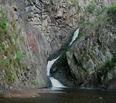 雙龍出海第二洩:二洩緊接一洩,落差為7.1米。瀑布下落時(shí),被一塊兀石分成兩半,分流如珠簾飄動(dòng),開朗而又深沉,又如雙龍出游不知天高地厚,古人有詩贊其曰:兩龍爭壑不知應(yīng),一石橫空不渡人。