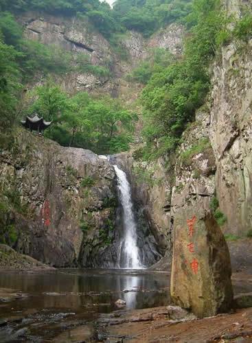 月籠輕紗第一洩:水流從石河瀉下,瀑布小巧平緩,柔美如月籠輕紗,雋永奇秀,“樂聲幽咽,萬松颯然,隔岸秋花爛漫,禽聲甚樂”,瀑布中間有一水潭,直徑1.5米,口微向內(nèi)收,四壁光滑,深不見底,人稱“小龍井”,俗呼小腳桶潭,是人工開鑿還是天然形成,還是一個(gè)謎,古人贊其曰:龍井鑿石灘,園勻如截竹;登波落纖埃,照見須眉綠。